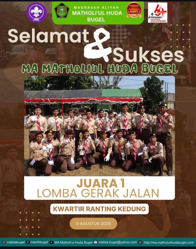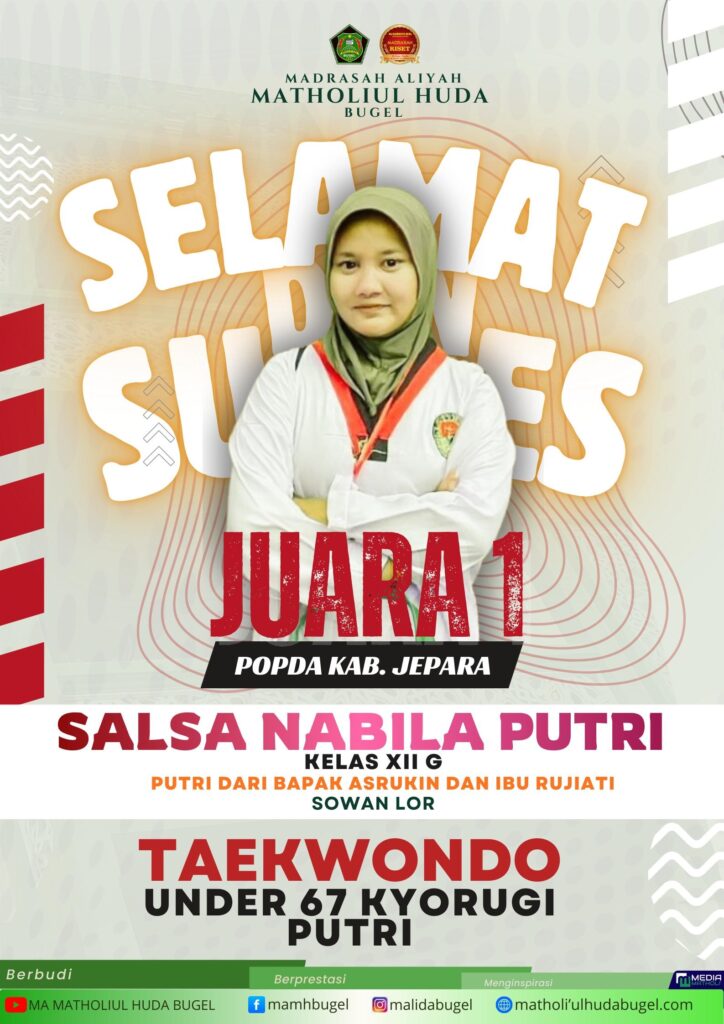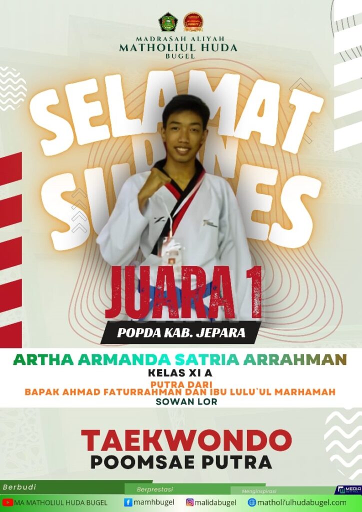 Jepara — Prestasi membanggakan kembali diraih oleh Madrasah Aliyah (MA) Matholi’ul Huda Bugel Kedung Jepara melalui salah satu siswanya, Arta Armanda Satria Arrahman, kelas XI.A, dalam ajang Pekan Olahraga Pelajar Daerah (POPDA) Kabupaten Jepara 2025. Arta sukses meraih medali emas pada cabang Taekwondo Poomsae Putra, setelah tampil memukau dan konsisten sepanjang kompetisi. Dalam babak penilaian, Arta menunjukkan penguasaan teknik yang Read More …